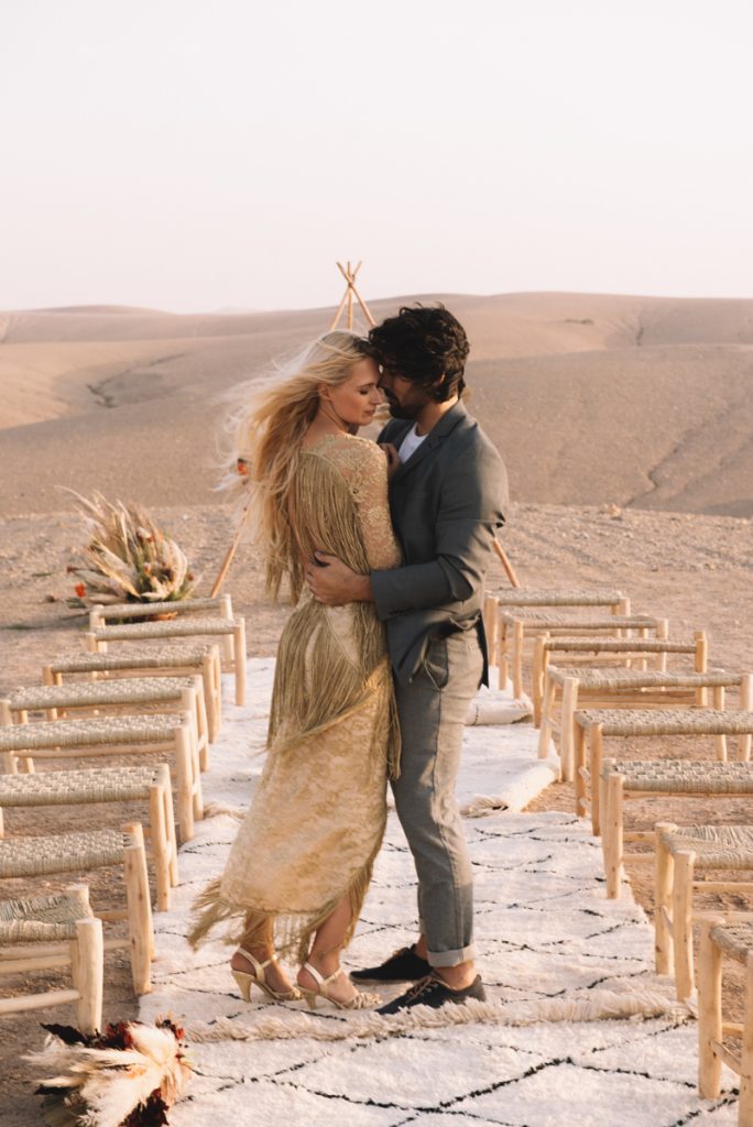 The morning sun painted the desert with shades of gold and amber, as Alana, a vision in a flowing, bohemian-inspired gown, and Alex, dashing in desert-appropriate attire, prepared to exchange vows beneath the vast expanse of the Moroccan sky. The desert, with its quiet majesty, served as a witness to their promises of forever.