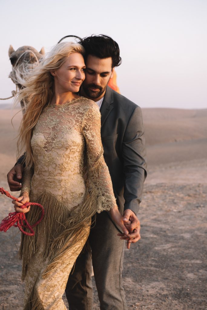 Their desert wedding reception was a true feast for the senses. A long table, adorned with desert blooms and flickering candles, stood beneath the star-studded sky. Traditional Moroccan dishes were served, and the desert air was filled with laughter and music.