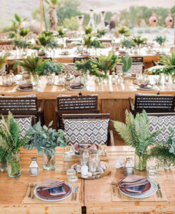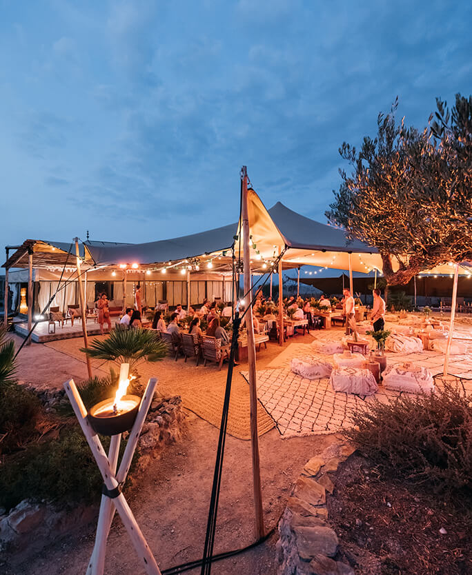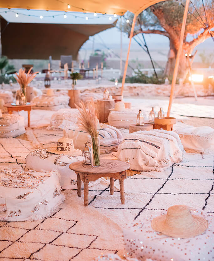 Every detail was meticulously attended to, especially the décor. Modern techniques seamlessly intertwined with national elements and accessories. Moroccan lamps and plush poufs in a sandy hue, an abundance of candles, and lush greenery contrasting with the desert surroundings all combined to create a unique and cozy atmosphere.