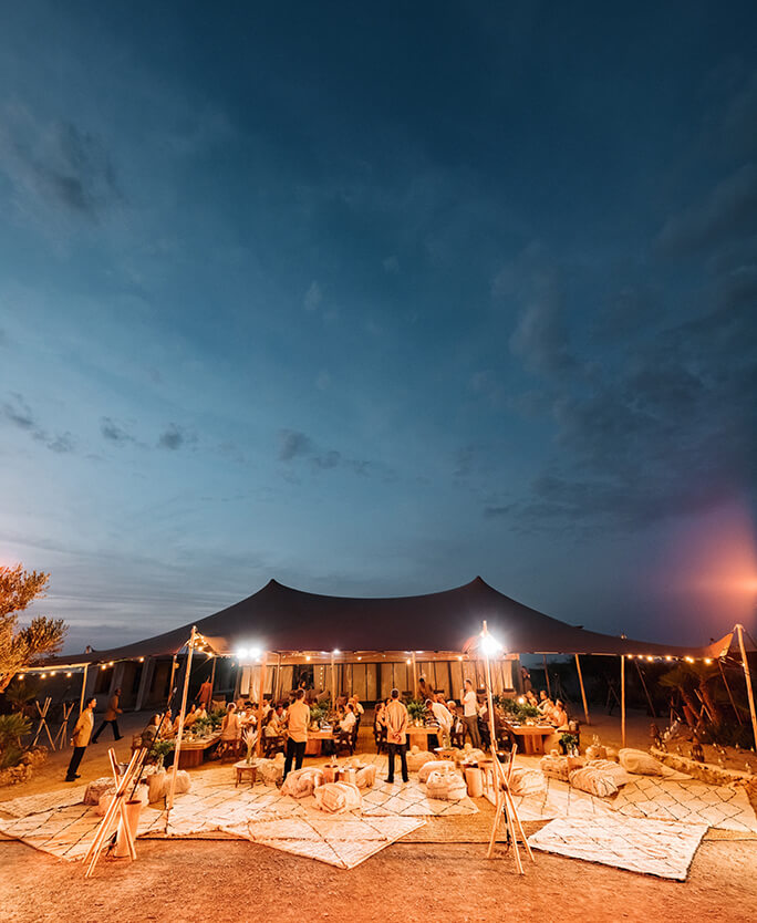 The deep golden hues of Morocco’s Agafay Desert, the jagged peaks of the Atlas Mountains, the soul-stirring melodies, and the flavors of traditional Moroccan cuisine—this evening was an emotional journey that immersed both the couple and their guests in the enigmatic aura of Morocco, preparing them for the impending wedding day.