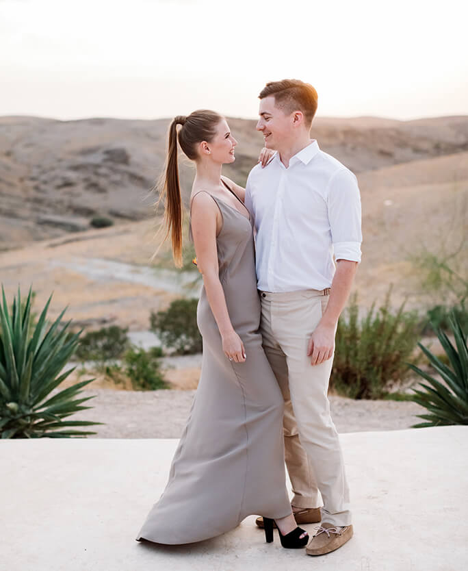 Imagine the setting sun casting a warm, ethereal glow over the rolling sand dunes. The sands, like liquid gold, ripple in the fading light. Jemes and Diana, dressed in traditional Moroccan attire, stand hand in hand on a carpet spread beneath a seemingly endless sky, where the first stars timidly twinkle.